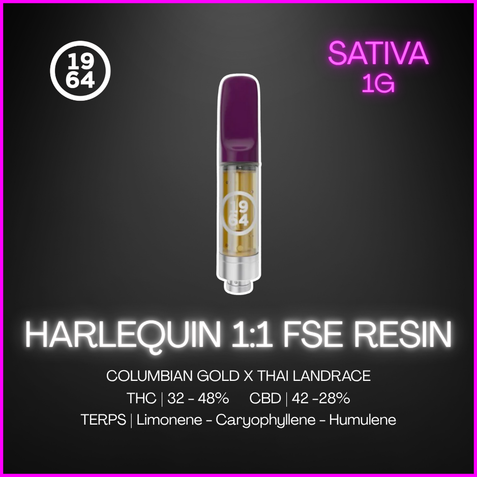 Available for a limited time only. 1964’s Harlequin 1:1 Vape is known for its harmonious 1:1 ratio of CBD and THC, this sativa-forward cultivar combines the legendary genetics of Colombian Gold and Thai landrace to deliver a smooth experience. Crafted with the same dedication to quality you’ve come to expect from 1964, this vape is your ideal companion for balance without compromise.