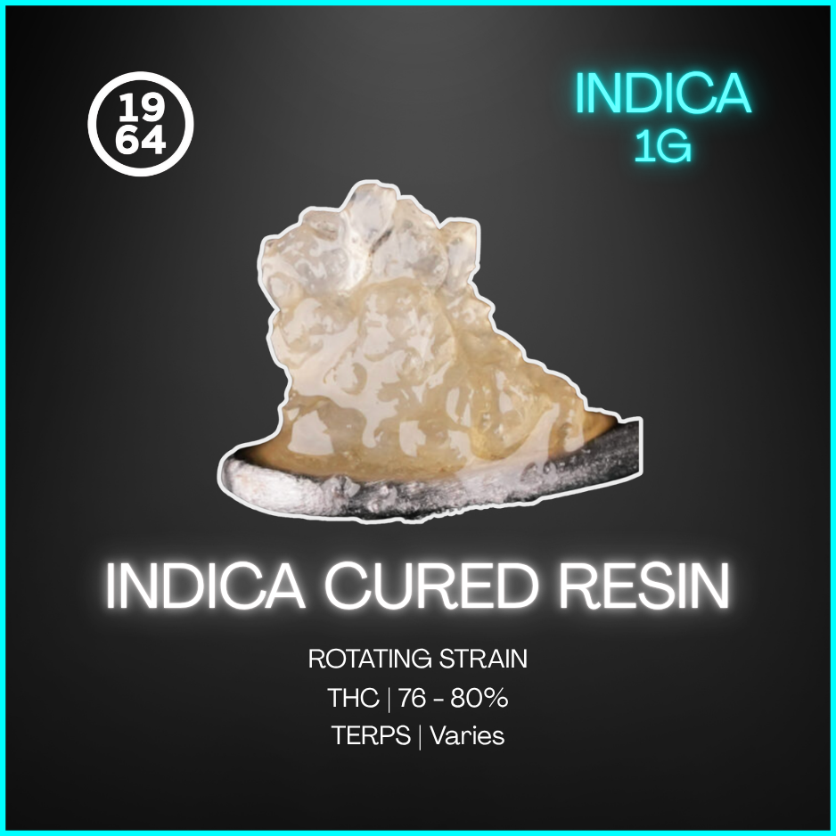 1g of indica-dominant cured resin made from a rotating selection of cultivars.
