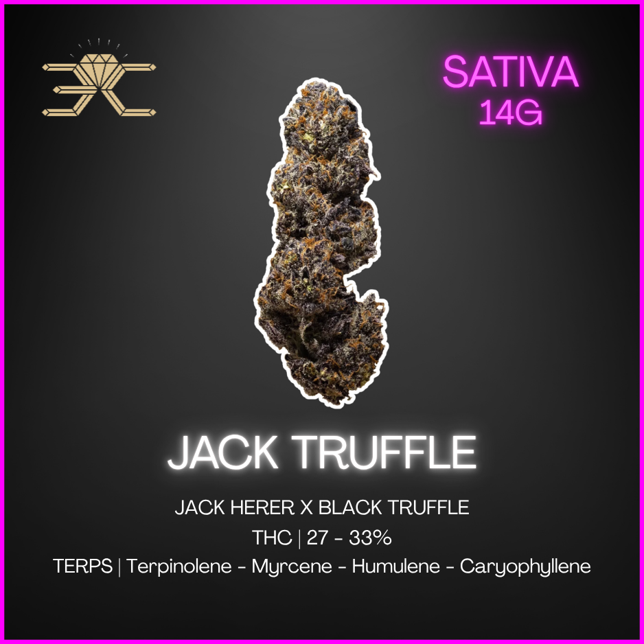 Jack Truffle, crafted by MaxYields, the prolific breeder behind 3rd Coast Genetics, is a potent sativa-dominant cultivar with high-THC levels. A fusion of the legendary Jack Herer and the esteemed Black Truffle, it offers a bold and flavourful sativa. Its terpene profile, including terpinolene, creates a striking blend of haze, fruit, and diesel, delivering a complex and invigorating aroma. Grown in small batches, this flower is hang-dried, hand-trimmed, cold-cured, and hand-packed to preserve maximum quality and flavour.