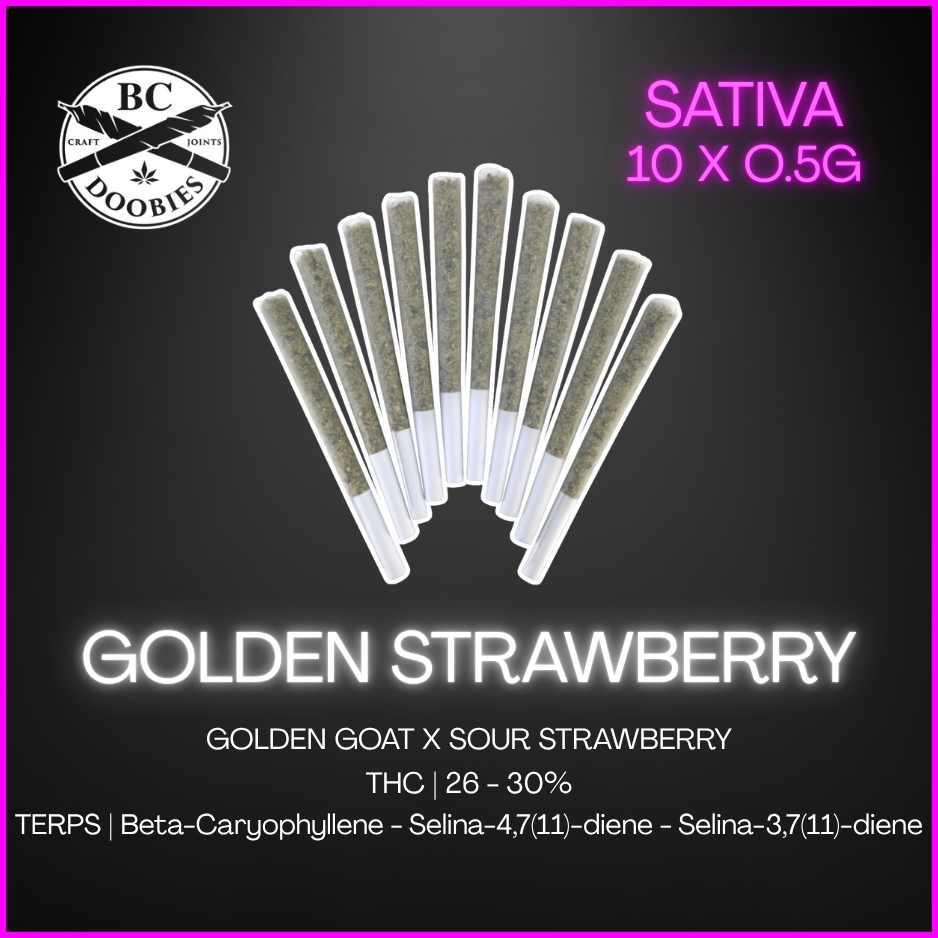The latest and greatest from BC Doobies, Golden Strawberry is a sativa-dominant cultivar that combines Golden Goat and Sour Strawberry. These perfectly rolled half-gram pre-rolls burn clean, smooth, and deliver a burst of sweet, sugary, fruit-like flavour. Terpenes include myrcene, limonene, and pinene.