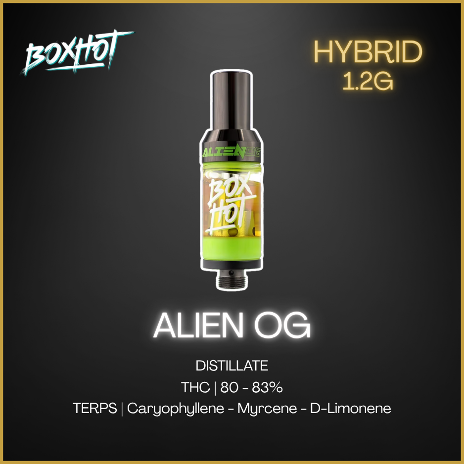 BOXHOT PRESENTS: Alien OG, a 1.2 g 510 threaded vape featuring a colossal 1000mg of THC and distillate infused with botanical terpenes. This extraterrestrial monster blasts you with gas, earthy, and lime flavors on the inhale and leaves you with fruity pine on the exhale. Compatible with button-activated 510 batteries. BOXHOT vapes are produced using CO2 extraction and refining processes, and feature an entourage of expertly infused premium strain-specific terpenes.