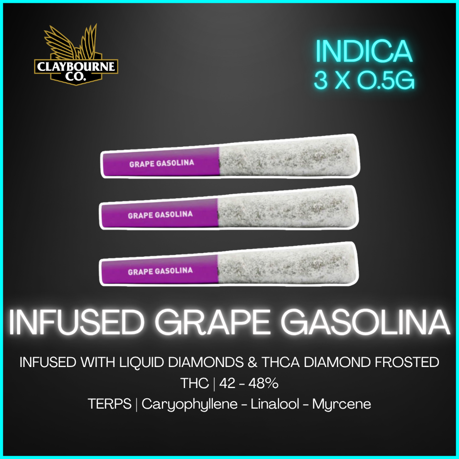 Claybourne Frosted Flyers Infused Grape Gasolina Pre-rolls are THCA-diamond frosted, terpene enhanced with natural flavouring agents, and infused with liquid diamonds. These half-gram pre-rolls are indica-dominant. Looking for bold flavour and a potent experience? Look no further than Claybourne Frosted Flyers.