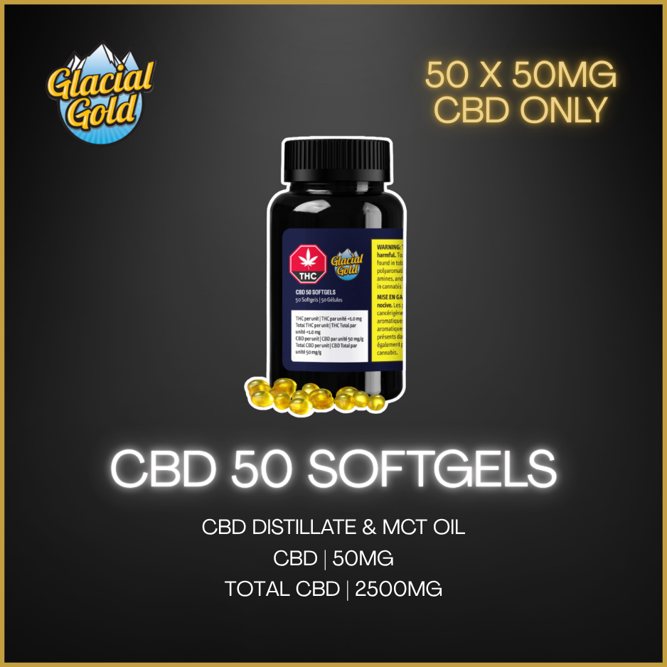 Introducing Glacial Gold CBD 50 Softgels 50-pack containing 2500 mg CBD. Glacial Gold CBD 50 Softgels are made with organic MCT oil from coconuts and high-purity distillates from Nextleaf Labs.