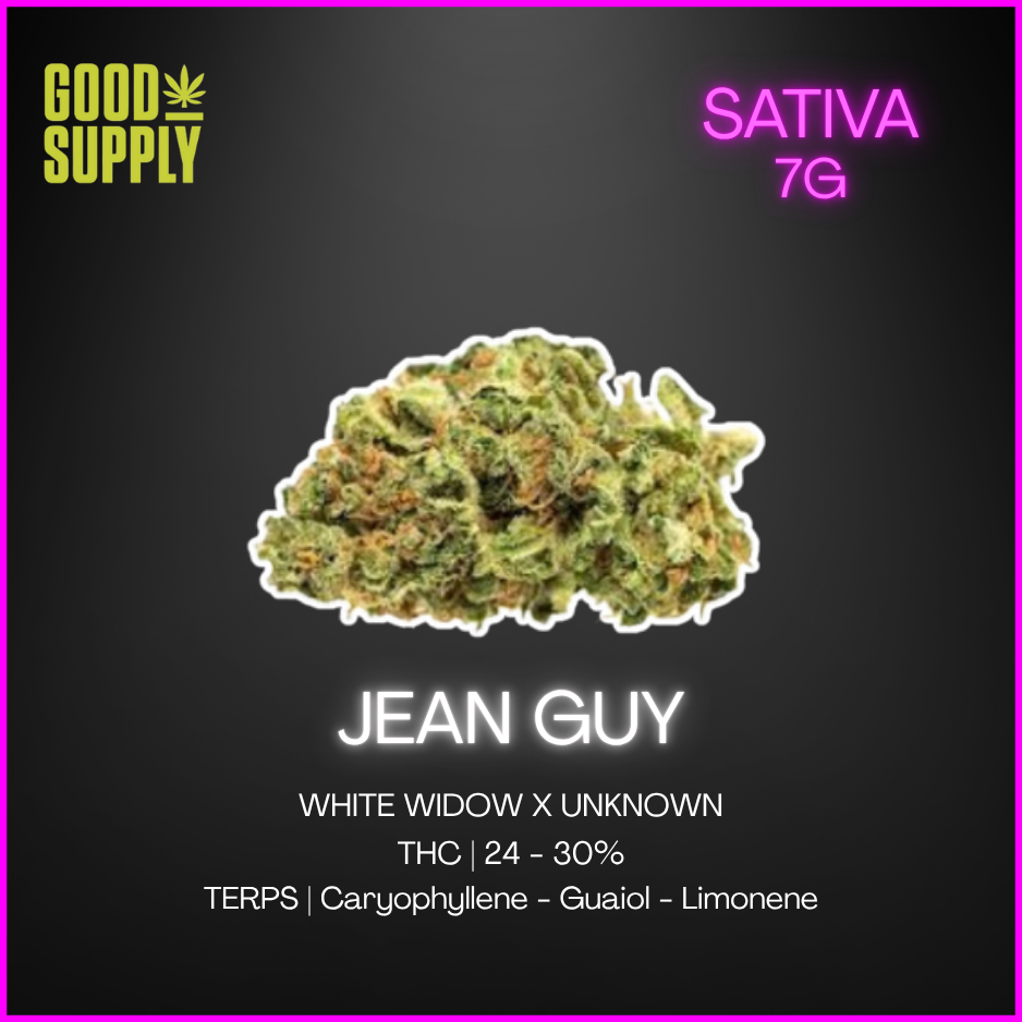 This medium-to-high THC flower is deep green, covered in trichomes and pack a citrusy punch. Good Supply's Jean Guy is a sativa-dominant strain and is greenhouse-grown.