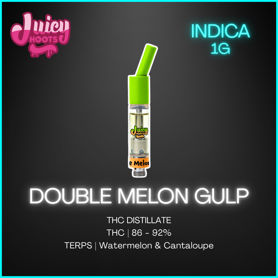 Say hello to Juicy Hoots – the groundbreaking cartridge hardware that takes "JUICY" to a whole new level with its unique straw mouthpiece! Immerse yourself in the delicious world of Double Melon Gulp, where the tantalizing flavours of watermelon and cantaloupe meet the sweet embrace of deliciousness, all infused with a generous amount of high-THC distillate and botanical terpenes. But here's the real game-changer – the stainless-steel straw mouthpiece cools the vapor, turning each draw into a refreshing blast. And it's compatible with 510-thread batteries for your convenience.