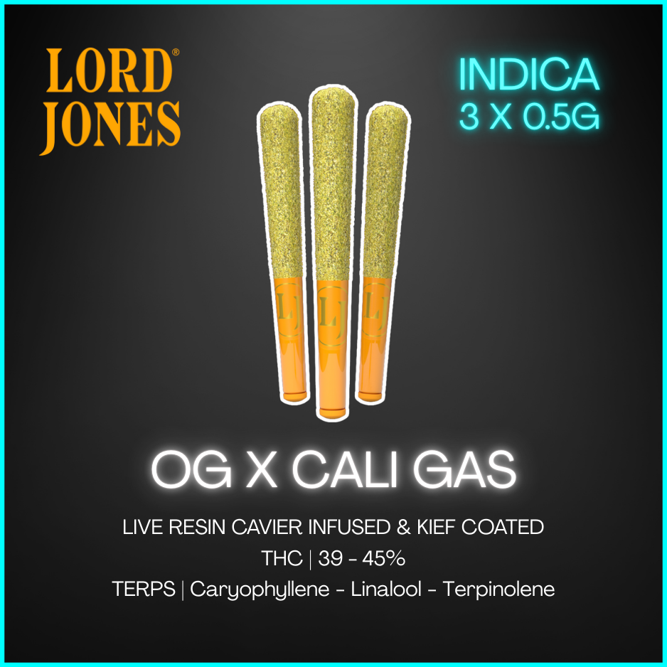 Lord Jones Live Resin Fusions are kief-coated and filled with high-potency, terpene-rich, live resin caviar and hard-hitting, single-strain flower sure to go beyond all expectations. With the Lord Jones Live Resin Fusions Hell Fire OG x Cali Gas, take yourself to the underworld of potency and flavour with a fusion of gassy and garlicy Cali Gas live resin caviar and Hell Fire OG flower. Finish strong with a dense pine aroma that fills the room with every exhale. With the addition of premium ceramic filters, your smoking experience is now smoother than ever.