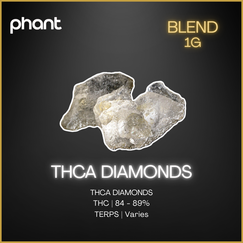 Phant Diamonds are made using flower grown in BC, cut freshly, and processed within two months of harvest. Using hydrocarbon extraction, the THCA is pulled from the plant and placed in pressure vessels. Over three weeks, a combination of heat and cold is then used to crystalize and form the diamonds into a highly pure and clean THCA product that can be dabbed or sprinkled as desired.