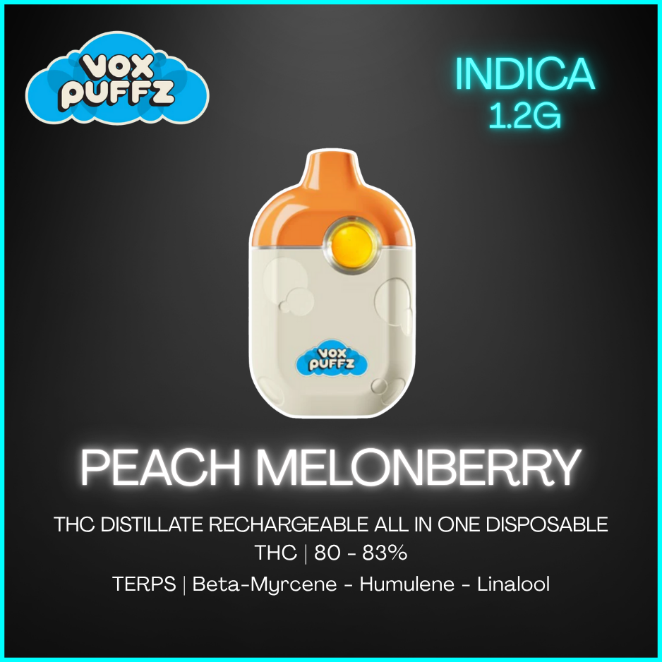VoxPuffz Peach Melonberry rechargeable All-in-One Vapes have a Voxtastic 1000mg of THC, and are triple distilled for purity and smoothness. From your very first puff to the last, you’ll sink into the deliciously sweet peach, raspberry, and watermelon flavour. This indica-dominant, distillate vape contains botanical terps with 80-83% THC.