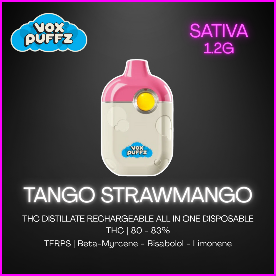 VoxPuffz Tango Strawmango rechargeable All-in-One Vapes have a Voxtastic 1000mg of THC, and are triple distilled for purity and smoothness. From your very first puff to the last, you’ll unleash the wildly delicious tangy strawberry and sweet, tropical mango flavour. This sativa-dominant, distillate vape contains botanical terps with 80-83% THC.