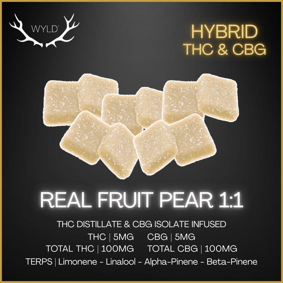 Wyld Pear hybrid THC:CBG gummies are a 1:1 product featuring a balanced dose of CBG. Made using real fruit, botanical terpenes and natural flavours. Each gummy contains 10mg THC and 10mg CBG, for a total of 100mg THC and 100mg CBG per pack. All Wyld gummies are packaged in compostable pouches and provide consistent experiences. Each Wyld Pear Hybrid Enhanced gummy contains 10mg THC and 10mg CBG combined with the terpenes limonene, linalool, alpha-pinene, and beta-pinene.